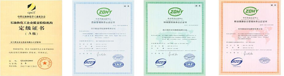 國光視產品為企業生命。公司通過了ISO19001質量管理體系認證,對產品生產流程進行嚴格的質量管理。國光質管部是國家石油和化學工業協會認定的“A級質檢機構”,配備了Agilent1100、1200A、1200B、1200C液相色譜儀、Agilent 6820氣相色譜儀、原子吸收分光光度計、原子熒光光譜儀等現代化的檢驗檢測設備。同時強化企業標準化建設和計量管理以確保產品質量。
