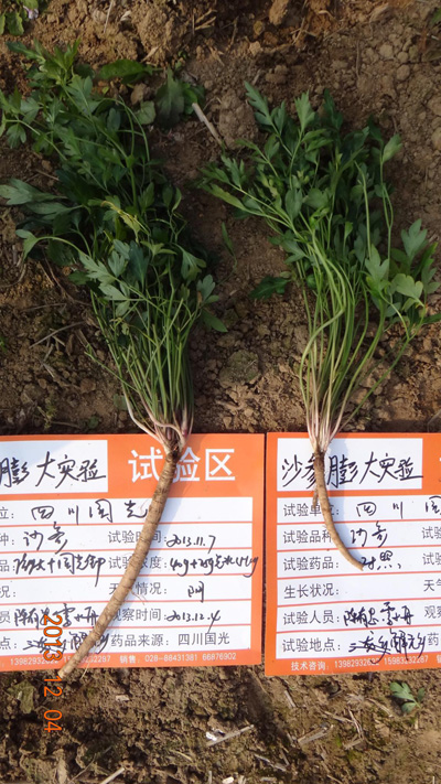 南沙參在12月開始地上部生長基本穩(wěn)定,地下根莖干物質(zhì)開始積累,根莖迅速膨大,此時正是根莖迅速膨大和積累干物質(zhì)的關(guān)鍵時期。通過有效的化學調(diào)控可以顯著的提高南沙參的產(chǎn)量和干物質(zhì)的積累。2013年12月閬中市解元鄉(xiāng)南沙參種植戶何維超使用以下化學調(diào)控技術(shù),其南沙參增產(chǎn)率達到20%以上。具體使用方法如下: