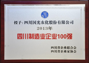 2013年11月19日,四川省企業聯合會、四川省企業家協會在成都金牛賓館召開2013四川企業100強、四川制造業企業100強、四川服務業企業50強發布暨企業發展峰會,四川國光農化股份有限公司榮獲四川制造業企業100強。