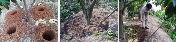 為了促進芒果根系正常生長和再生,在不同時期應對果園做深耕和翻土處理。冬季(或采果修剪后)應結合深翻改土,沿樹冠垂直線下挖(60cm深、30cm寬)環溝、對溝或圓形溝,切斷土壤下層的粗根,經曬五、六天,然后施采果肥,用表土和植物殘體加以回填。結合清園,進行中耕翻土(20cm深),以切斷表土的吸收根,減弱地下部分對地上部分水分和養分輸送,有利地上部分營養物質積累,促進花芽分化。