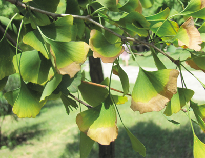 近年來,該銀杏樹出現樹勢衰弱的情況,銀杏葉片小,甚至部分枝條不發葉的情況,較多老葉邊緣出現焦枯的現象;林業部門立即聯系國光名木古樹救護人員,邀請技術員到現場對古銀杏進行診斷。通過現場檢測發現古銀杏根部的土壤通透性差,土壤PH值偏堿,土壤中有機質缺乏;挖開根部的土壤,觀察發現,古銀杏根系有腐爛的情況,根部土壤水分含量較高;較多葉片出現邊緣焦枯的現象(圖1)。