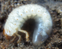 蠐螬體肥大,體型彎曲呈C型,多為白色,少數(shù)為黃白色。頭部褐色,上顎顯著,腹部腫脹。體壁較柔軟多皺,體表疏生細(xì)毛。頭大而圓,多為黃褐色,生有左右對稱的剛毛,剛毛數(shù)量的多少常為分種的特征。如華北大黑鰓金龜?shù)挠紫x為3對,黃褐麗金龜幼蟲為5對。蠐螬具胸足3對,一般后足較長。腹部10節(jié),第10節(jié)稱為臀節(jié),臀節(jié)上生有刺毛,其數(shù)目的多少和排列方式也是分種的重要特征。